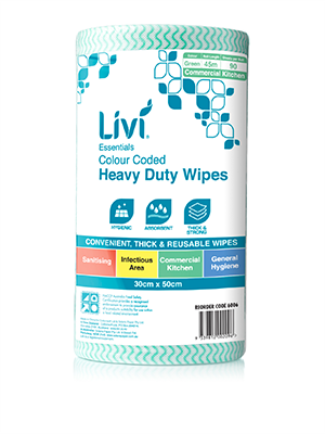 Livi commercial wipes are convenient, hygienic, absorbent, thick and reusable. Avoid cross contamination with the colour-coded applications. Green is for Kitchen.